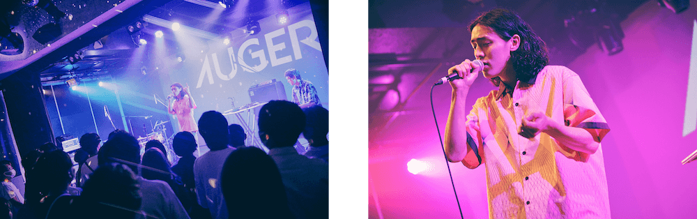 2組目に登場したのは、新東京。新東京は東京を中心に活動する4人組のロックバンドでメンバー全員が現役大学生です。様々なジャンルの楽曲を手掛け、幅広い世代から愛されており、色気のある歌声や高い演奏技術、そして上質で洗練された楽曲が特長です。1曲目は、「sanagi」を披露し、その後も立て続けに「Polaroid」、「The Few」、「utopian」、「Heavy Fog」、「Cynical City」、「36℃」の6曲を披露。特に、結成後初めてリリースした人気楽曲「Cynical City」を披露した際には、参加者は一気にパフォーマンスに引き込まれました。さらに、MCでは「今日は、様々なジャンルのアーティストやDJが登場するので、それぞれからAUGERらしさを感じ取ってもらいたいです。」と語ったうえで、「イベント前にAUGERのセットをもらって、メンバー全員、世界で一番薄い爪切りを使って早速爪を切ってきました。」とエピソードを披露し、会場の笑いを誘いました。
