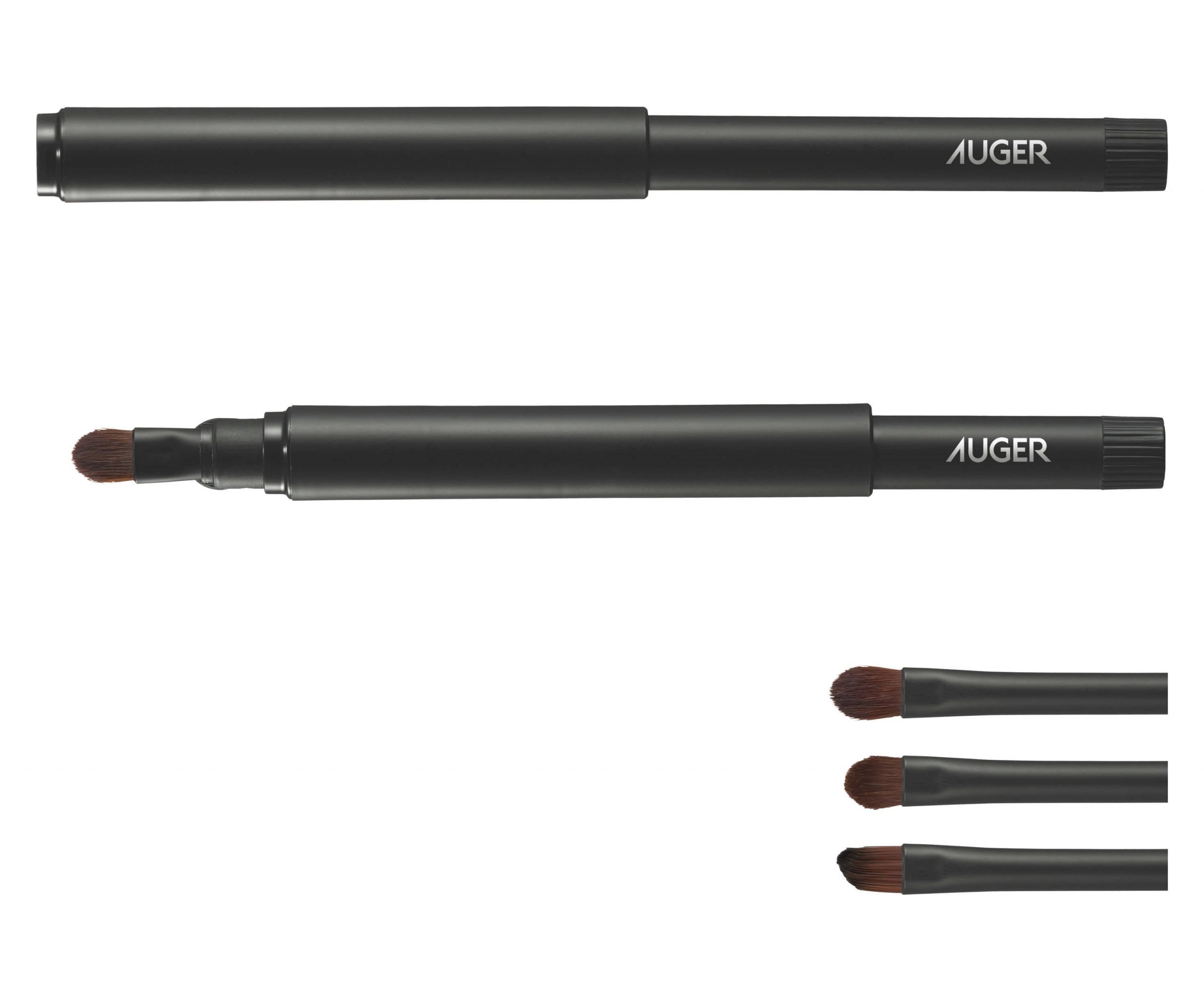 「AUGERマルチユーズブラシ」は、アイシャドウブラシ、ポイントシャドウブラシ、アイブロウブラシの3種類のブラシヘッドを付け替えることで、1本でマルチにご活用いただけるメイクアップブラシです。使用していくうちに傷みやすいブラシヘッドを交換することで、柄の部分をより長くご使用いただけます。さらに、ブラシヘッドを取り外せるため、持ち運びやお手入れもしやすいアイテムとなっております。