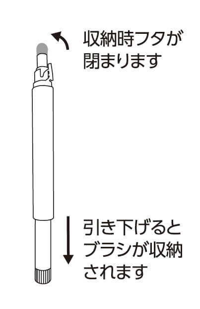 ブラシ本体はスライド式のキャップ付きで、持ち運びや保管がしやすくなっています。ブラシをスライドするだけでキャップを開けることができ、片手で扱える操作性のよさにもこだわりました。