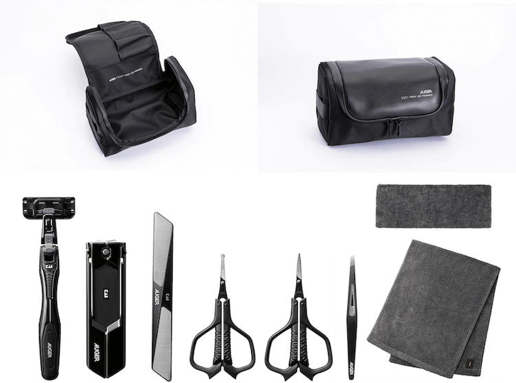 「AUGER」のシステムカミソリ、ツメキリM Revolver、ネイルファイル、オシャレハサミ、セーフティハサミ、毛抜き、ヘアバンド、タオルと、それらを全て収納できる「5351POUR LES HOMMES」のオリジナルポーチの計9アイテムがセットになって登場いたします。