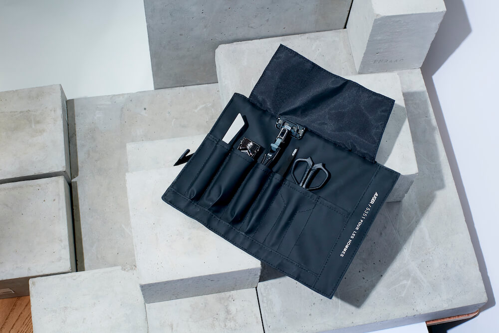 本限定セットは「AUGER®」ブランドのシステムカミソリ、ツメキリM Revolver、ネイルファイル、オシャレハサミ、セーフティハサミ、毛抜き、さらにそれらが全て収納できる 「5351POUR LES HOMMES」のロール型ケースを含む計7アイテムがセットになった限定商品です。普段のお手入れにはもちろん、外出時や旅先にも使いやすいラインナップになっています。