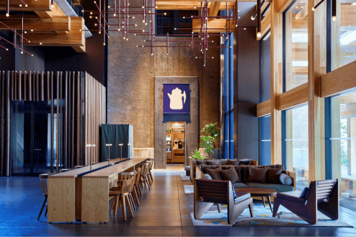 リテールショップとアートギャラリーを含むインスピレーション溢れるロビー、受賞歴のあるパートナーシェフ、ウェス・アヴィラ、ケイティ・コール、マーク・ヴェトリ率いる3つの個性的なレストラン、ホワイトオーク材を使用した広々としたグリッドや庭園の中庭を見渡せる全面ガラス張りの壁など、細部にまでこだわったフレキシブルなイベントスペース、日本初のスタンプタウン・コーヒー・ロースターズのカフェ、緑豊かな中庭など、地元の人々や観光客に友情、発見、文化交流の場を提供しています。