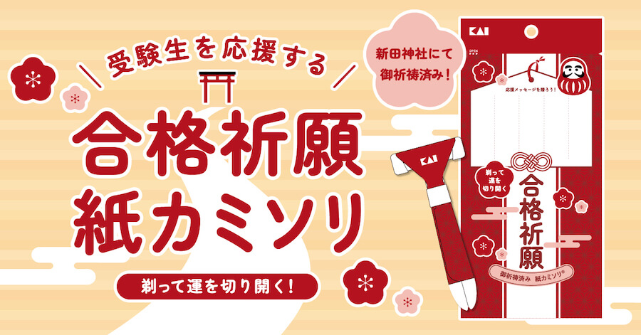 グローバル刃物メーカーの貝印株式会社(本社:東京都千代田区、代表取締役社長兼COO: 遠藤 浩彰)は、頑張る受験生やその家族を応援するため、新田神社(東京都大田区)にて御祈祷いただいた特別デザインの「紙カミソリ®」を2023年1月3日(火)から数量限定で無料配布いたします。