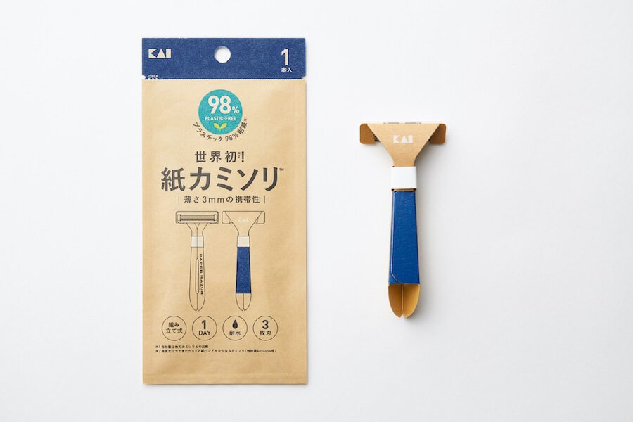「紙カミソリ®」は使い捨てカミソリ国内シェアNo.1※1の貝印が、サステナビリティやSDGs(持続可能な開発目標)達成に向けた社会機運の高まりを受け、その一助となるべく開発。グローバル刃物メーカーとして長年培った知見を最大限に活用し、カミソリのハンドルに紙、刃体(ヘッド全体含む)に金属を使用した脱プラスチック※2なアイテムです。2021年4月22日(木)に公式オンラインストア「KAIストア」にてテスト発売し、2022年3月全国発売が決定しました。