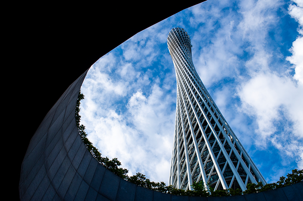 全高600メートルの〈広州塔〉を足下から。鼓がねじれているような独特の形状。圧倒的な高さで、街のいろいろな場所から発見できる。