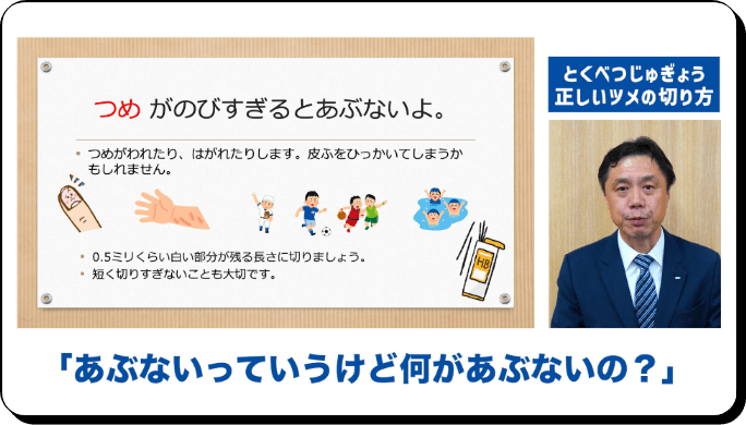 「つめとつめ切りのお話」として、爪のケアやツメキリの使い方を伝える取り組みを始めました。
