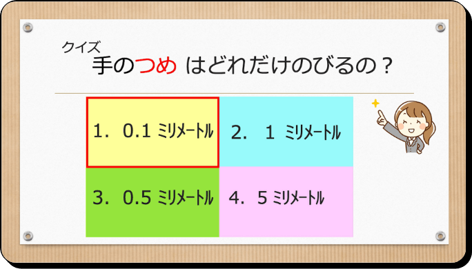 つめの正しい切り方やつめはいつ切ると良いか、つめは何のためにあるかなどがわかったので家族にもつめに関することを話したりクイズも出してみようとおもいました。