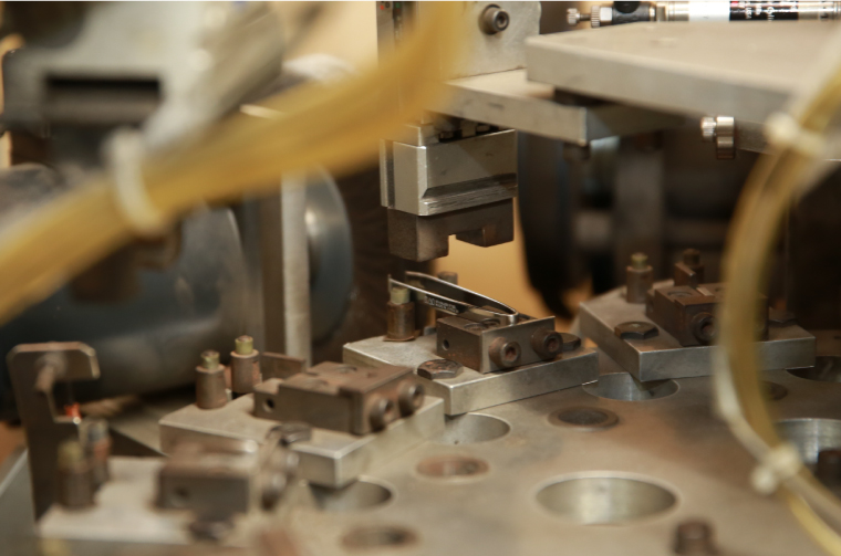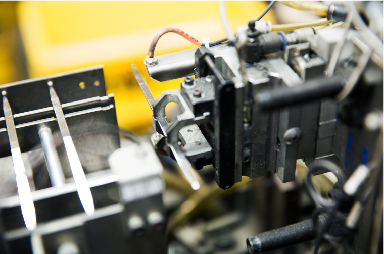 先端がぴったりと合うように、機械にセットした砥石でていねいに磨いていきます。さらに毛をつかみやすいように、内側も同じように磨いてきます。完了したらモニターで仕上がりをチェックします。