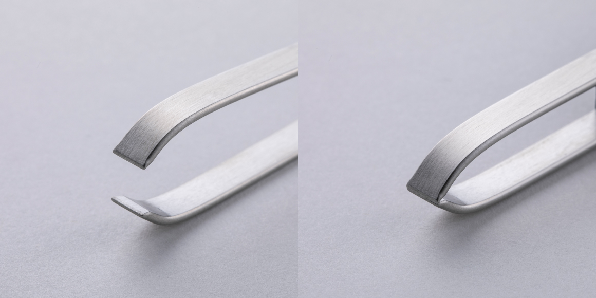 先端を磨いただけでは、毛をつまむ部分に厚みが出てしまい、毛がつかみにくくなります。そこで先端の内側を研磨し、斜めに角度をつけることで先端を鋭くし、細い毛もつかめるようにします。ただし、研ぎすぎると毛が切れてしまうので、ほどよい角度に調整しています。
