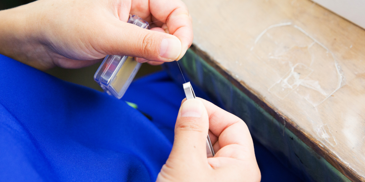 U型は先端が平らで、毛をつまむ幅が広いのが特徴。1枚の板を折り曲げて作るため、先端の長さをそろえるのが実はとても難しいのです。少しでもU字に曲げる位置がズレてしまうと先端に隙間ができてしまい、毛をつまみにくかったり、つまんでも切れてしまったりと不具合が出ます。そのため、まず先端を砥石で研磨し、長さをそろえます。