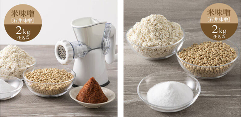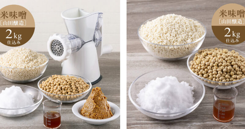 ミンサー付米味噌セットと、原材料のみ米味噌セット2kg仕込みの2種類をご用意しております。