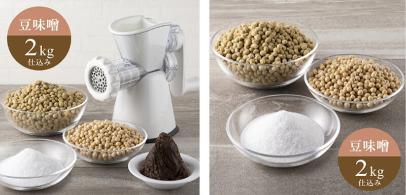 ミンサー付豆味噌セットと、原材料のみ豆味噌セット2kg仕込みの2種類をご用意しております。