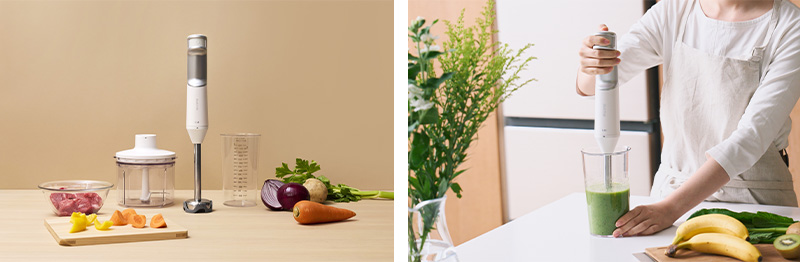 今回登場するコードレスブレンダーと専用チョッパーは、貝印が培ってきた「刃物づくりの技術」をそのまま活かした、本格仕様のコードレス調理ツールです。毎日の料理に使うからこそ、シンプルさと使いやすさを追求した、美しく機能的な1台です。ブレンダーは1種類の刃で様々な食材を滑らかに撹拌することができ、専用チョッパーはコードレスタイプでも大容量の調理が可能です。洗練されたデザインと使いやすさで、日々の調理をより快適に楽しくし、新しいレシピにも挑戦したくなる製品となっています。