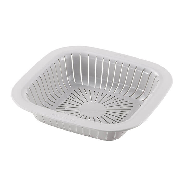 今回発売するのは、現代のライフスタイルに合わせ、調理作業の負担を減らして多様に活用できる調理容器、クッキングコンテナです。浅型(トレー)・コランダー※・深型(トレー)の3つのパーツを組み合わせて、下ごしらえから仕上げまで様々な調理作業ができ、すべてのパーツを電子レンジで使用できます。