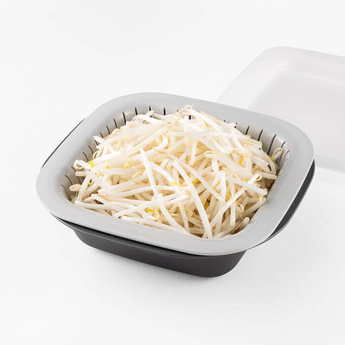 - ①コランダーをセットしたコンテナ深型皿にもやし1袋を入れ、浅型(トレー)皿をフタにしてかぶせ電子レンジ600Wで3分加熱する。