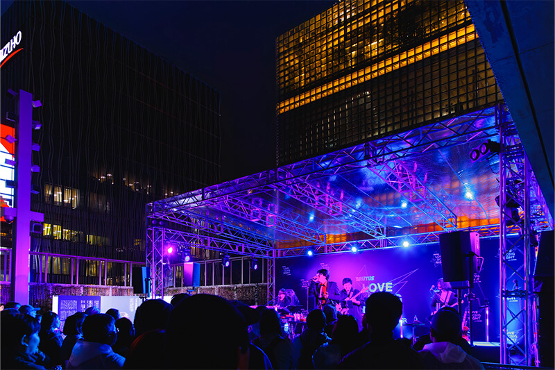 最初に登場したのは、優河さん。アコースティックギターを抱えて登場し、リリース前の「All the words you said」、そして18歳の時に初めて書いた楽曲「愛を」を皮切りに弾き語りでのパフォーマンスが始まりました。深くのびやかな歌声とギターの豊かな音色が、車が行き交う音やクラクション、街の喧騒と自然に溶け合い、辺り一帯に心地よく響き渡りました。その後も、2019年リリースの「めぐる」、ベッド・ミドラーの「The Rose」のカバー、そして亡き祖母への思いを込め、自分の中では最大のラブソングだという「灯火」の、全6曲を披露した優河さん。会場中がその静かな優しさに包み込まれた、美しい30分間となりました。