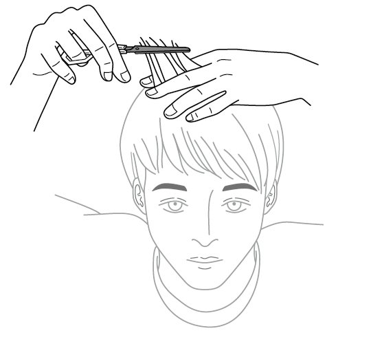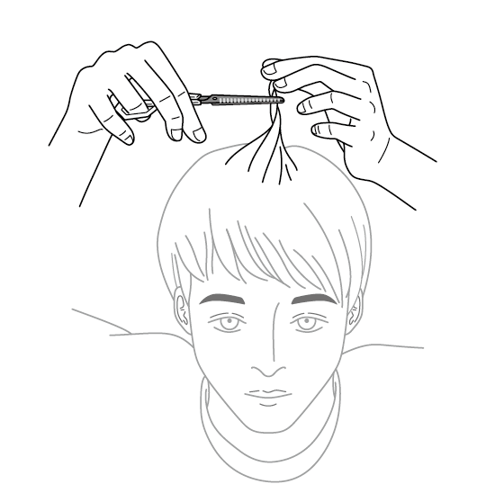 上(毛量の多い)の部分を真上に引き出してねじります。前髪と顔まわりの1~2cmはあまり切らないようにします。1回切ったら髪の毛を落とし、バランスを整えましょう。