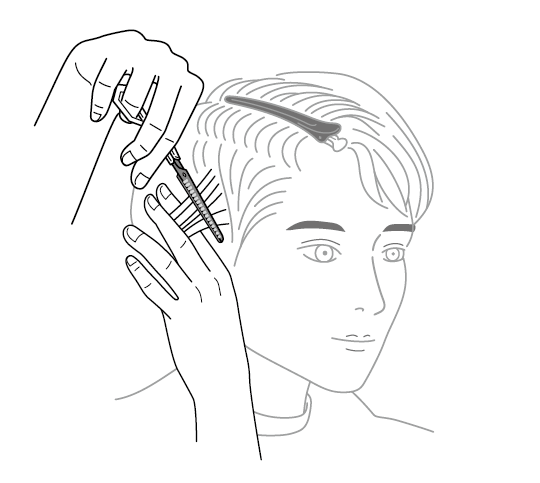 ヘアクリップを使って髪を上下に分けると、カットの邪魔になりにくいです。指で髪を縦にとり、スキハサミで中央あたりを一回切ります。一回切った後で毛量を確認し、多い場合はもう一度切るのがおすすめ。頭の後方から前にかけ、数回に分けてカットしましょう。片側を整え終わったら、反対側も同じようにカットします。